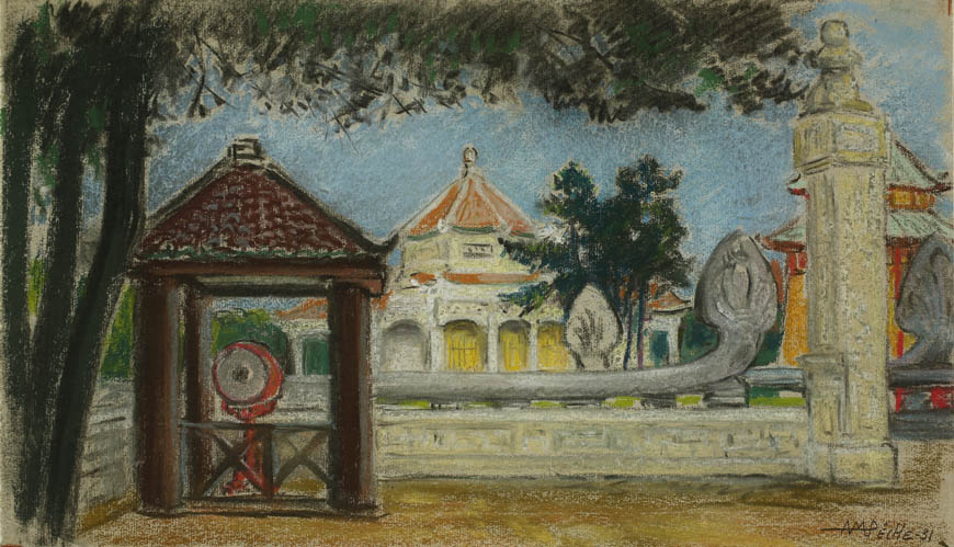 Alexandre-Mathurin Pêche dépeint remarquablement les ambiances exotiques créées par les architectures coloniales, les figurants en costumes traditionnels et les dromadaires présents à l'exposition.