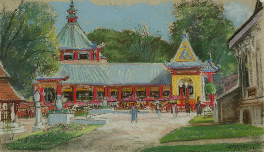 Alexandre-Mathurin Pêche dépeint remarquablement les ambiances exotiques créées par les architectures coloniales, les figurants en costumes traditionnels et les dromadaires présents à l'exposition.