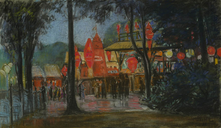 Alexandre-Mathurin Pêche dépeint remarquablement les ambiances exotiques créées par les architectures coloniales, les figurants en costumes traditionnels et les dromadaires présents à l'exposition.
