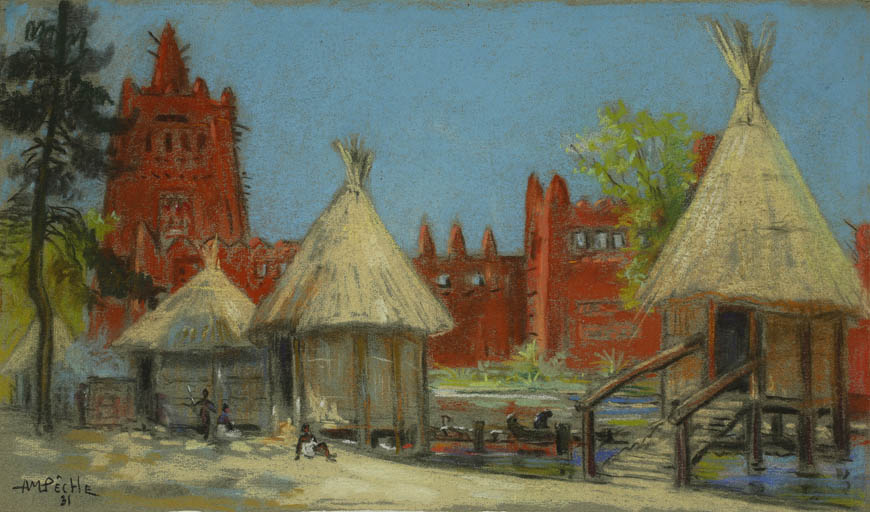 Alexandre-Mathurin Pêche dépeint remarquablement les ambiances exotiques créées par les architectures coloniales, les figurants en costumes traditionnels et les dromadaires présents à l'exposition.