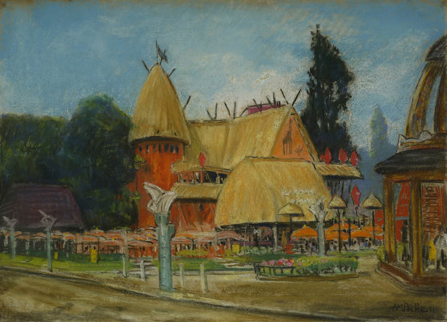 Alexandre-Mathurin Pêche dépeint remarquablement les ambiances exotiques créées par les architectures coloniales, les figurants en costumes traditionnels et les dromadaires présents à l'exposition.