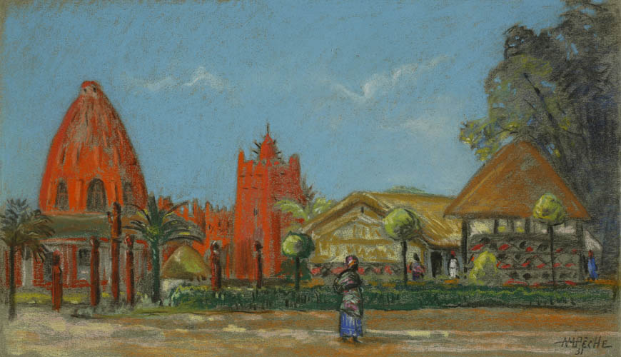 Alexandre-Mathurin Pêche dépeint remarquablement les ambiances exotiques créées par les architectures coloniales, les figurants en costumes traditionnels et les dromadaires présents à l'exposition.