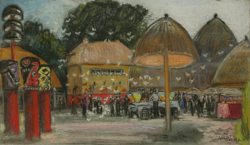 Alexandre-Mathurin Pêche dépeint remarquablement les ambiances exotiques créées par les architectures coloniales, les figurants en costumes traditionnels et les dromadaires présents à l'exposition.