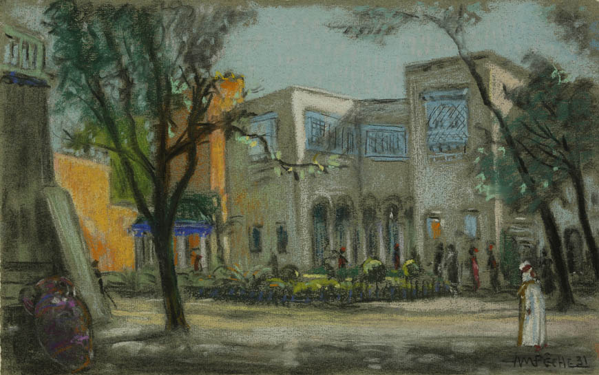 Alexandre-Mathurin Pêche dépeint remarquablement les ambiances exotiques créées par les architectures coloniales, les figurants en costumes traditionnels et les dromadaires présents à l'exposition.