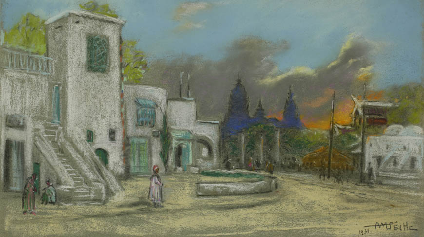 Alexandre-Mathurin Pêche dépeint remarquablement les ambiances exotiques créées par les architectures coloniales, les figurants en costumes traditionnels et les dromadaires présents à l'exposition.