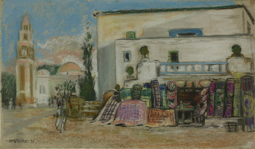 Alexandre-Mathurin Pêche dépeint remarquablement les ambiances exotiques créées par les architectures coloniales, les figurants en costumes traditionnels et les dromadaires présents à l'exposition.