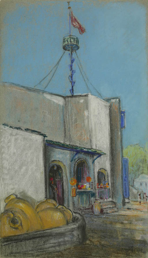 Alexandre-Mathurin Pêche dépeint remarquablement les ambiances exotiques créées par les architectures coloniales, les figurants en costumes traditionnels et les dromadaires présents à l'exposition.