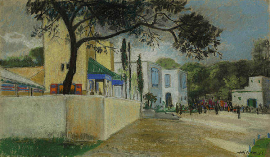Alexandre-Mathurin Pêche dépeint remarquablement les ambiances exotiques créées par les architectures coloniales, les figurants en costumes traditionnels et les dromadaires présents à l'exposition.