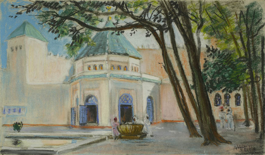 Alexandre-Mathurin Pêche dépeint remarquablement les ambiances exotiques créées par les architectures coloniales, les figurants en costumes traditionnels et les dromadaires présents à l'exposition.