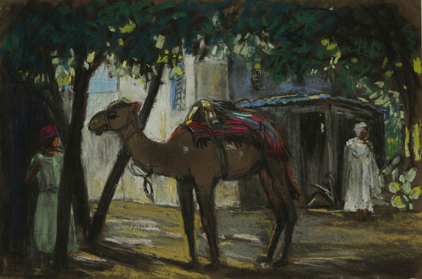 Alexandre-Mathurin Pêche dépeint remarquablement les ambiances exotiques créées par les architectures coloniales, les figurants en costumes traditionnels et les dromadaires présents à l'exposition.