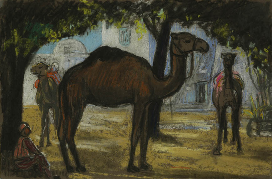 Alexandre-Mathurin Pêche dépeint remarquablement les ambiances exotiques créées par les architectures coloniales, les figurants en costumes traditionnels et les dromadaires présents à l'exposition.