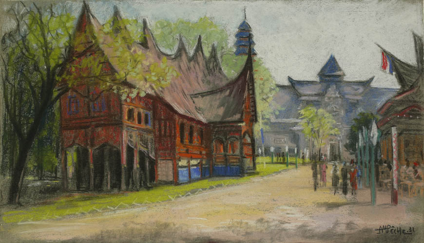 Alexandre-Mathurin Pêche dépeint remarquablement les ambiances exotiques créées par les architectures coloniales, les figurants en costumes traditionnels et les dromadaires présents à l'exposition.