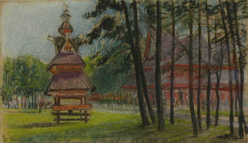 Alexandre-Mathurin Pêche dépeint remarquablement les ambiances exotiques créées par les architectures coloniales, les figurants en costumes traditionnels et les dromadaires présents à l'exposition.