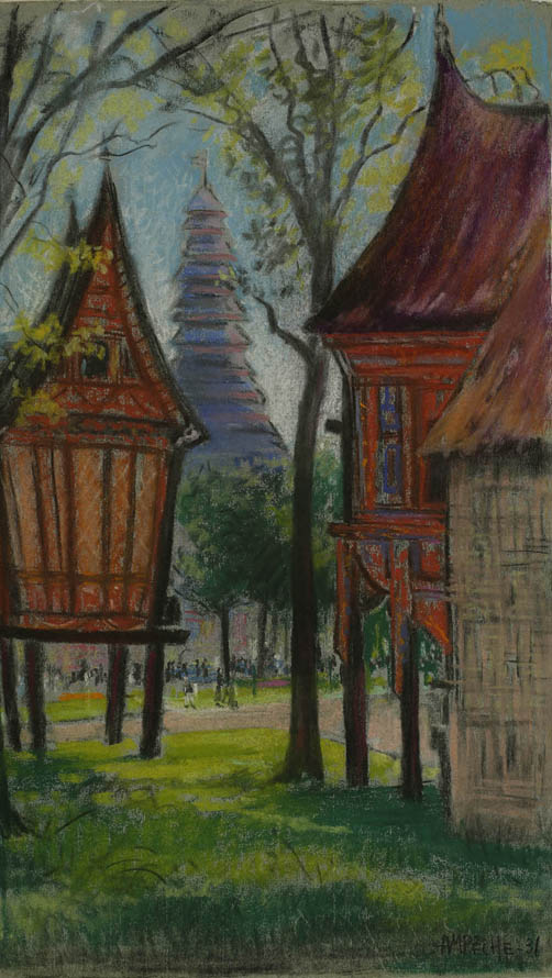 Alexandre-Mathurin Pêche dépeint remarquablement les ambiances exotiques créées par les architectures coloniales, les figurants en costumes traditionnels et les dromadaires présents à l'exposition.