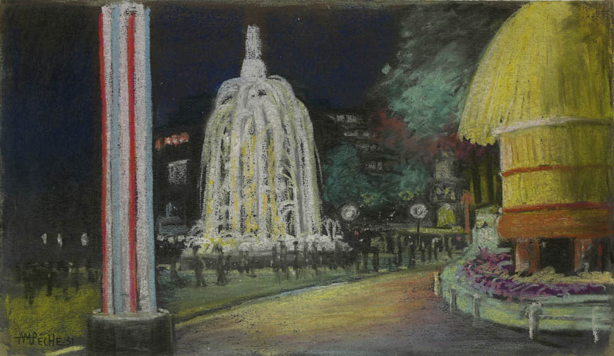 Alexandre-Mathurin Pêche dépeint remarquablement les ambiances exotiques créées par les architectures coloniales, les figurants en costumes traditionnels et les dromadaires présents à l'exposition.
