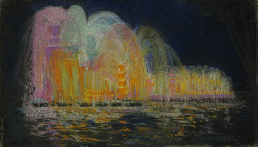 Alexandre-Mathurin Pêche dépeint remarquablement les ambiances exotiques créées par les architectures coloniales, les figurants en costumes traditionnels et les dromadaires présents à l'exposition.