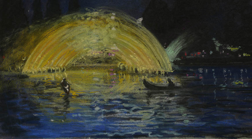 Alexandre-Mathurin Pêche dépeint remarquablement les ambiances exotiques créées par les architectures coloniales, les figurants en costumes traditionnels et les dromadaires présents à l'exposition.