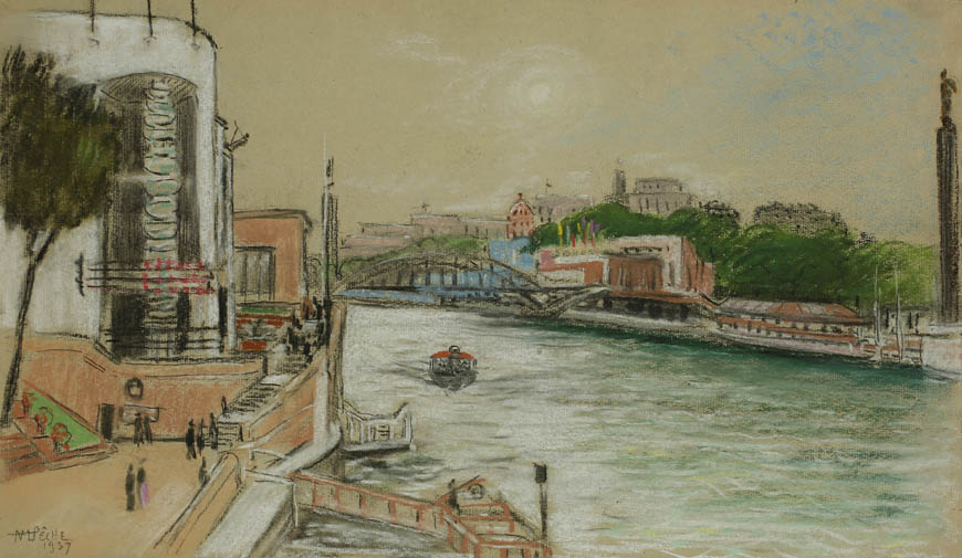 À travers ses pastels, Alexandre-Mathurin Pêche s'attache à représenter la modernité, particulièrement visible dans l'architecture avant-gardiste de certains pavillons.