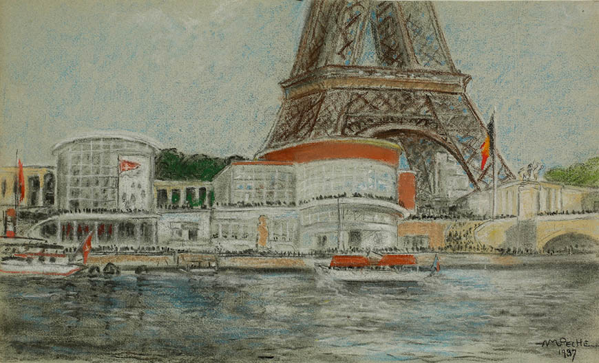 À travers ses pastels, Alexandre-Mathurin Pêche s'attache à représenter la modernité, particulièrement visible dans l'architecture avant-gardiste de certains pavillons.
