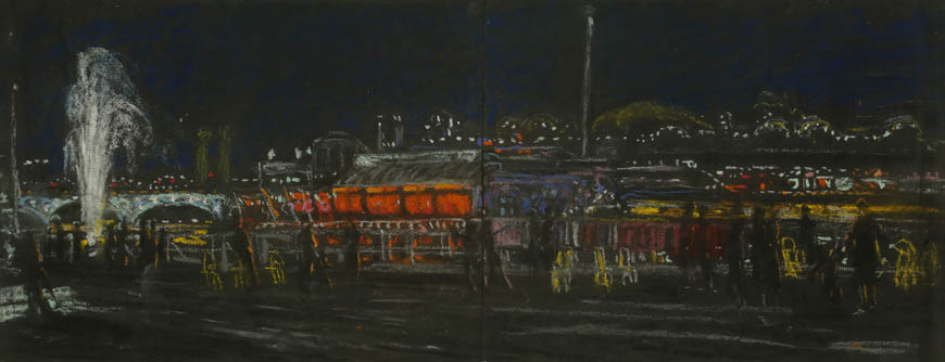À travers ses pastels, Alexandre-Mathurin Pêche s'attache à représenter la modernité, particulièrement visible dans l'architecture avant-gardiste de certains pavillons.