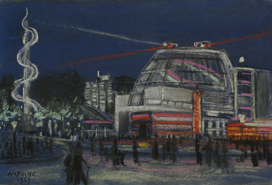 À travers ses pastels, Alexandre-Mathurin Pêche s'attache à représenter la modernité, particulièrement visible dans l'architecture avant-gardiste de certains pavillons.