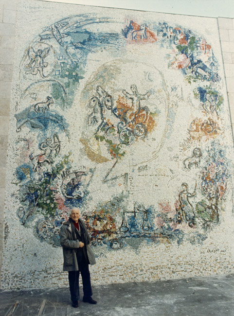 Vue de Marc Chagall posant devant la mosaïque achevée. Cliché Raph Gatti. Non daté